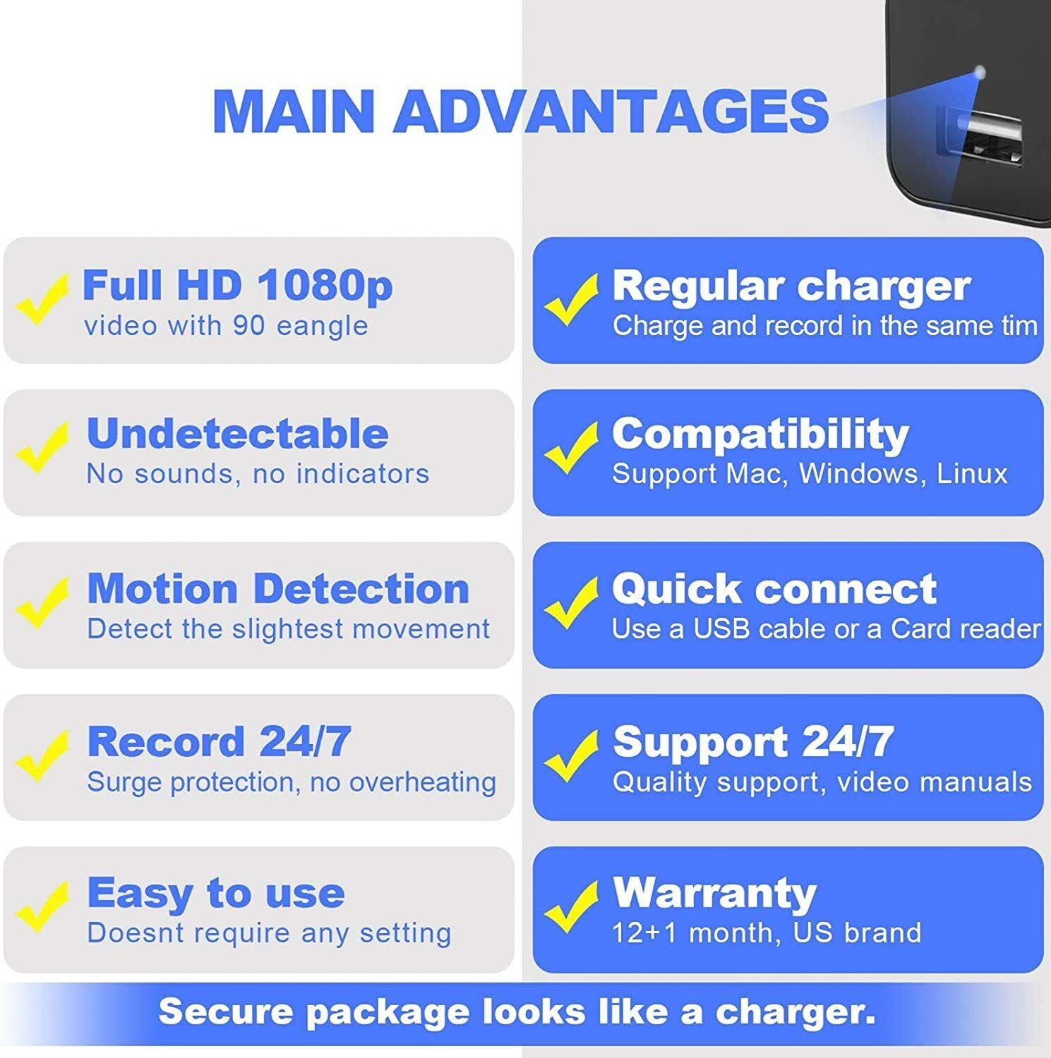 4.Small and Powerful:  It's a small phone charger and also mini spy camera.It can simultaneously charges the phone and records 1080P full HD video.You can take the usb charger camera anywhere.Spy stuff for real spys.