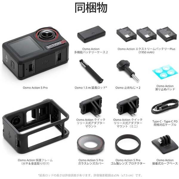 付属品‎Osmo 1.5 m 延長ロッド ×1, Osmo Action 5 Pro ×1, Osmo Action 5 Pro ガラスレンズカバー ×1, Osmo Action 5 Pro ゴム製レンズ プロテクター ×1, Osmo Action エクストリームバッテリーPlus(1950 mAh)×3, Osmo Action クイックリリース式アダプターマウント ×1, Osmo Action クイックリリース式アダプターマウント(ミニ)×1, Osmo Action 保護フレーム(水平&垂直取り付け)×1, Osmo Action 多機能バッテリーケース 2 ×1, Osmo Action 接着式カーブベース ×1, Osmo Action 滑り止めパッド ×1, Osmo 止めねじ ×2, Type-C - Type-C PD規格対応ケーブル ×1