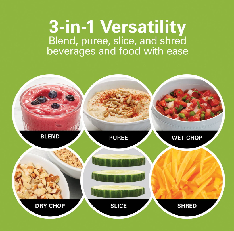 The versatile Hamilton Beach Multi Blend Kitchen System does the work of 3 separate appliances: a traditional kitchen blender, a food processor, and a personal blender. It has a powerful motor with 800 watts of peak power that crushes ice, blends, mixes, chops, slices, shreds and more. A single Multi Blend Blade System handles all your blending and food processing needs. Just choose the right attachment: the 52 oz. glass Multi Blend Jar, the 20 oz. personal jar for single-serve smoothies and shakes, or the food processor attachment with an included slicing and shredding disc. Use the 52 oz. glass blending jar with drip-free pouring spout to make a batch of milkshakes or to puree fresh pasta sauce. Or, swap the jar for the 3-cup food processor attachment to chop vegetables or mince garlic for a stir fry; it includes a chute and food pusher to make adding foods easy. The single-serve 20 oz. travel jar is perfect for morning smoothies when you're in a hurry. It's BPA free and includes a leak-proof lid for drinking on the go. Designed for quieter blending, the Hamilton Beach? Multi Blend Kitchen System is easy to operate, with all the power you need and simple controls. Hamilton Beach Multi Blend Kitchen System, 3-in-1 Blender with Food Processor Attachment, 52 oz. Blending Jar, and 20 oz. Travel Jar, 58176: