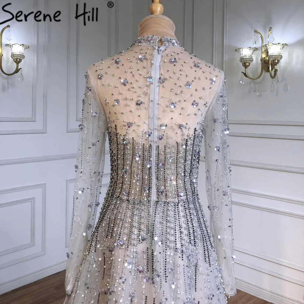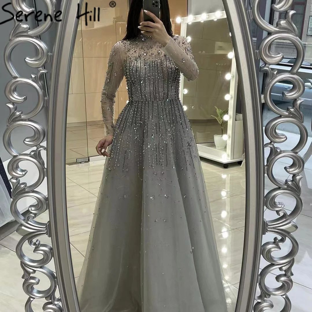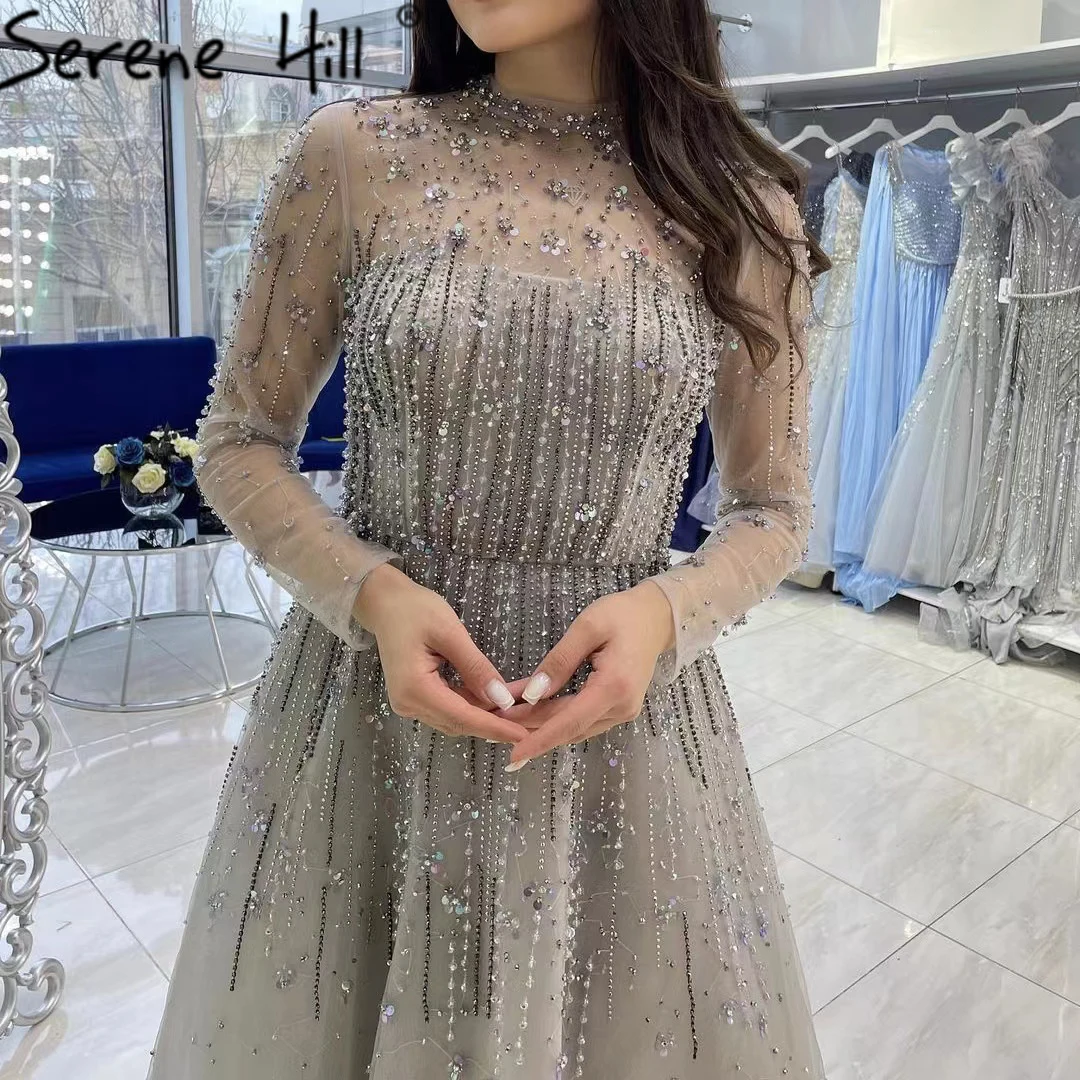 SERENE HILL Dubai Luxury Grey Beaded A-Line Evening Dresses 2023 Modest For Muslim Women Party Gown Prom Dress CLA71227