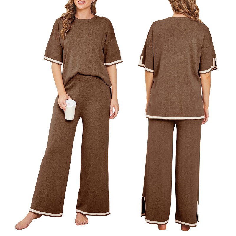 Women Casual Outfit Short Sleeve Crew Neck Tops Wide Leg Pants Loungewear Set